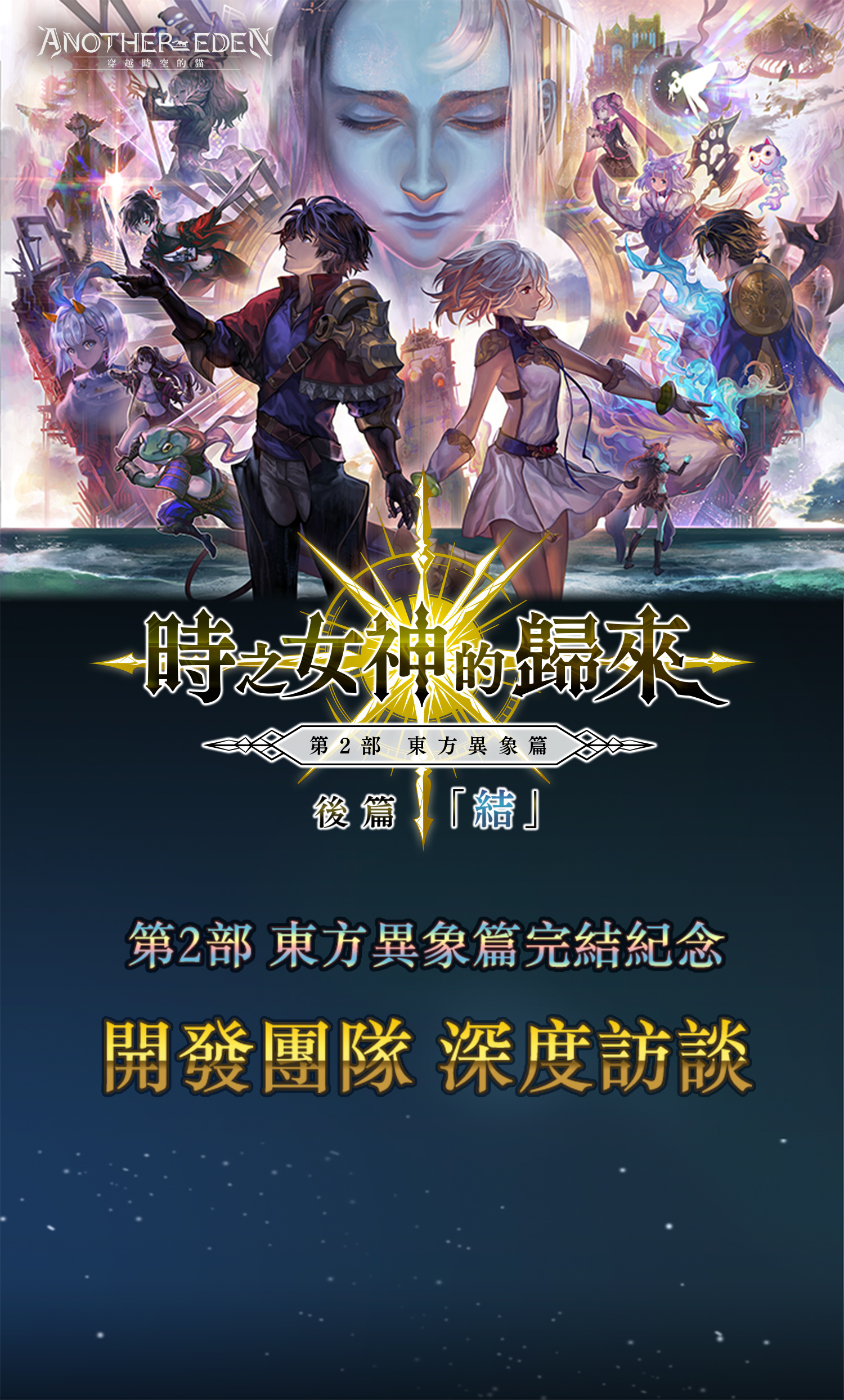 果然還是製作時間很長這點,讓大家等太久我也感到非常抱歉,從第1部開始阿爾德和菲妮一家的故事總算告了一個段落。團隊中年輕的成員也不少,在製作過程中不斷成長,讓Another Eden不斷提升等級,每次製作新的內容時都會感受到團隊成員的成長讓作品的品質大幅提升。隨著故事的進展,我也感受到Another Eden更加茁壯成長。各位玩家實際遊玩應該也能感受到團隊的進化,雖然第2部完結並且告一個段落,希望各位能盡情享受,並且持續關注團隊今後的發展。(Backy)感謝各位參與今天的訪談。